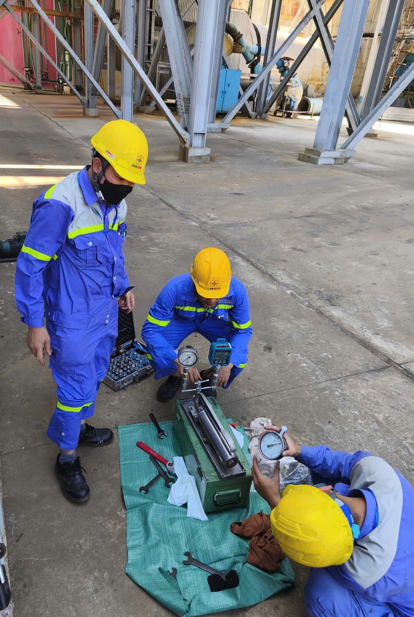 Đội ngũ kỹ sư EVNNPS thực hiện hiệu chỉnh và kiểm tra các thiết bị đo lường cầm tay khi lắp đặt vào hệ thống giám sát của máy nghiền